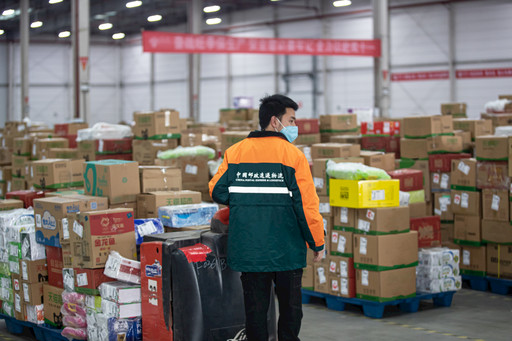 重庆邮政员工正在电商企业仓库中搬运包裹准备装车发运。 朱亚坤 摄