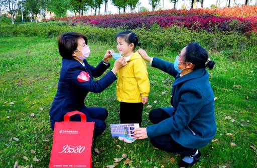 3月20日,邮储银行安徽省金寨县支行在“邮爱公益日”设立三周年之际,开展宣传活动。在疫情防控期间,该支行创新举措,让宣传活动、疫情防控及文明创建相结合,将企业品牌宣传与践行社会责任深度融合。图为该支行宣传人员在公园执勤点向居民介绍“邮爱公益”时,为小朋友戴上防护口罩。 □李明 摄影报道