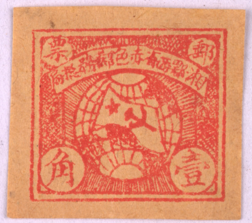 据集邮学者考证,“壹角邮票”由湘鄂西省邮政总局(湘鄂西省赤色邮务总局)发行,邮票图幅24×22毫米,黄纸上刷红色,石印,无齿孔。主体图案为:地球中央套一面镰锤、五星图案的旗帜;地球周围放射状纹;地球图案上方自右至左印有弧形排列的正楷“湘鄂西省赤色邮务总局”字样,四角圆形开光分别印有宋体“邮票”“壹角”字样。