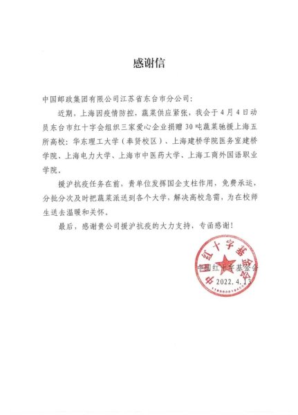 4月4日至7日,盐城三家爱心企业通过中国红十字基金会与上海红十字会取得联系,将30吨新鲜蔬菜捐赠给华东理工大学等6所上海高校。东台分公司急派专人专车三次往返、日夜兼程,将所有蔬菜火速送达指定地点。
