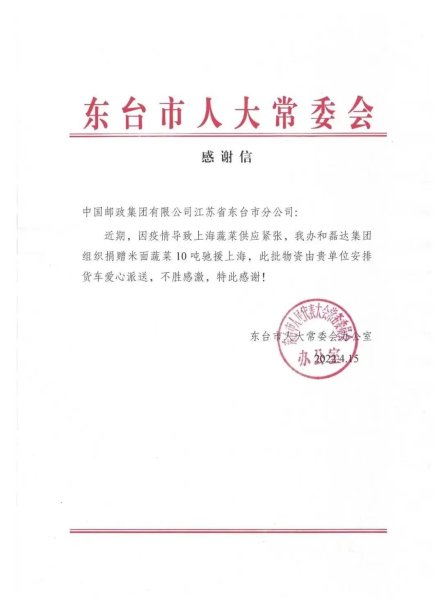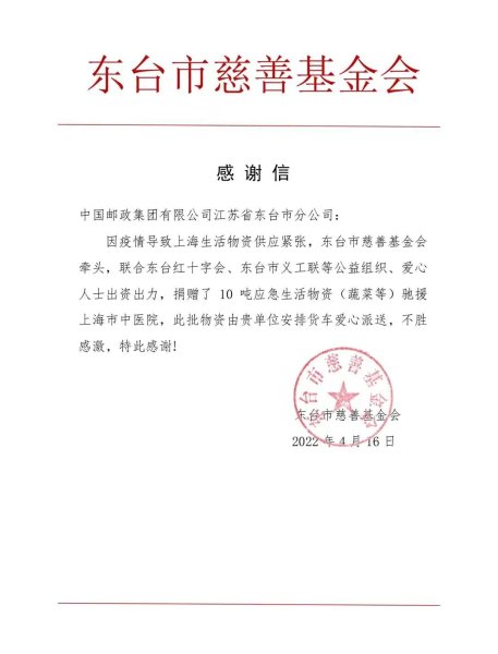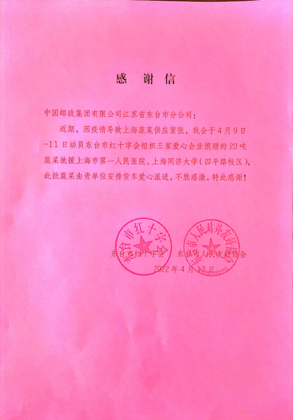 近日,盐城市东台邮政分公司收到了来自中国红十字会、东台市人大常委会、东台市慈善基金会、东台市红十字会和东台市人民对外友好协会的四封感谢信,感谢东台邮政发挥行业“国家队”的主力军作用,主动承担援沪抗疫任务,第一时间将抗疫物资运达上海,为苏沪疫情防控工作中作出了积极出贡献。
