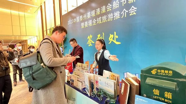 近日,2023中国泰州姜堰溱潼会船节星空平台发布会暨姜堰全域旅游推介会在上海召开,来自星空平台媒体、大型旅行社等机构的百余人参加此次活动。姜堰区邮政分公司作为此次发布会伴手礼供应方,定制了百余份“美丽姜堰”文创礼包,让现场与会人员感受到了“邮”文化、“邮”纪念、“邮”互动的特色服务。