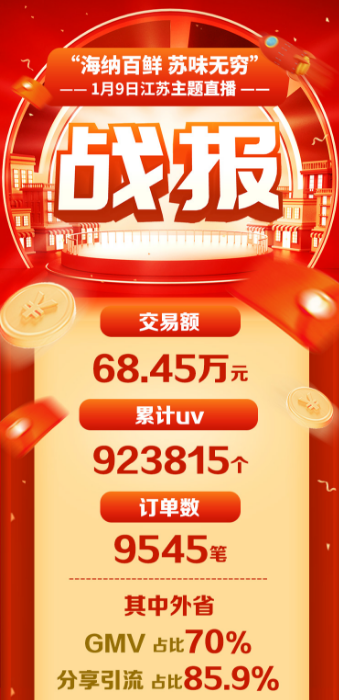 1月9日,根据年货节主题活动安排,由省分公司组织、邮乐直播基地支撑、全省助力推广,开展了“海纳百鲜 苏味无穷”连云港海产品主题直播活动。直播间观看人数 92.4万人,实现交易额68.5万元,外省销售占比超七成。